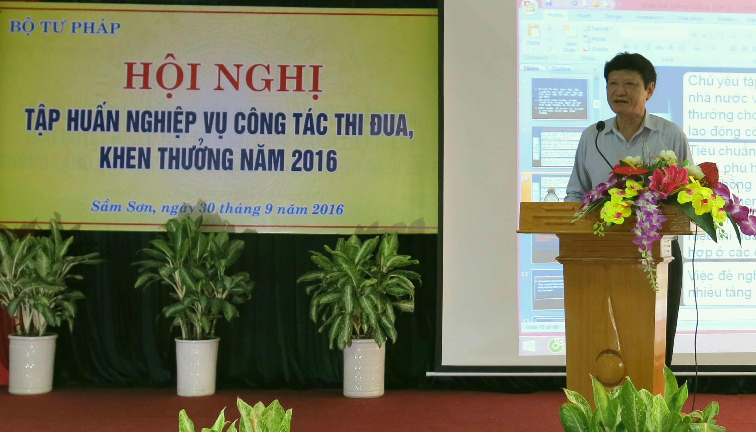 Trong điều kiện hệ thống thể chế về công tác thi đua, khen thưởng đang dần được hoàn thiện, Thông tư số 14/2015/TT-BTP ngày 14/10/2015 của Bộ Tư pháp hướng dẫn công tác thi đua, khen thưởng trong ngành Tư pháp có hiệu lực từ ngày 17/11/2015 với nhiều nội dung được sửa đổi, bổ sung, phù hợp với Luật và các văn bản hướng dẫn thi hành, đáp ứng được với đặc thù, yêu cầu, đòi hỏi của thực tiễn tổ chức phong trào thi đua ngành Tư pháp cũng đã được đồng chí Nguyễn Thị Tố Nga giới thiệu, quán triệt tại Hội nghị. Hội nghị cũng được nghe đại diện Tổng cục Thi hành án dân sự giới thiệu khái quát một số nội dung, yêu cầu liên quan đến công tác thi đua, khen thưởng năm 2016 của hệ thống cơ quan thi hành án dân sự.